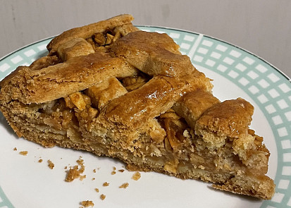 Troubu zapneme na 180 °C. Plech vymažeme tukem a vysypeme hrubou moukou.Jablka oloupeme a nahrubo nastrouháme. Promícháme s oběma cukry a pudinkovým práškem.Mouku smícháme s kypřicím práškem, přidáme změklý tuk, cukr, mléko a vypracujeme hladké těsto. Rozdělíme ho na dvě poloviny.První polovinu těsta rozválíme na placku a přeneseme na připravený plech. Na těsto rozetřeme připravenou náplň z jablek. Náplň překryjeme druhou rozválenou polovinou těsta. Okraje dobře utěsníme.Na závěr těsto potřeme rozehřátým máslem, vejcem nebo mlékem.Vložíme do předehřáté trouby a pečeme na 180 °C asi 30 minut, aby jablka byla propečená a těsto mělo zlatavou barvu.