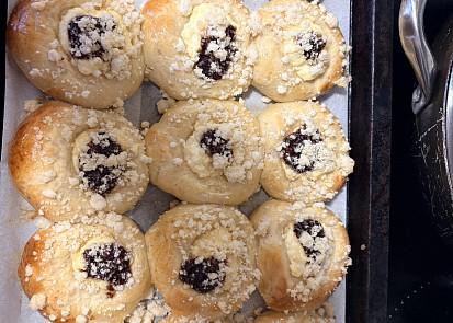 1) tvarohová náplň: tvarohy v kostce smícháme s třtinovým cukrem, vejcem, citronovou kůrou a šťávou, rumem a vanilkovým pudinkem (pokud bude hmota příliš tuhá, můžeme přidat trochu mléka, ale je lepší hustší, aby při pečení nevytékala z koláčků).