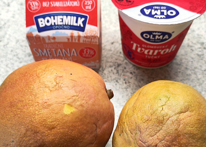 Mango odpeckujeme a lžící vydlabeme, nakrájíme na kostičky a nahrubo pomačkáme, nebo, kdo chce rozmixuje na kaši.Smetanu ušleháme do tuha, pak zašleháme tvaroh, přidáme mango a podle chuti dosladíme.Směs přendáme do vaničky a za občasného promíchání necháme zmrazit.