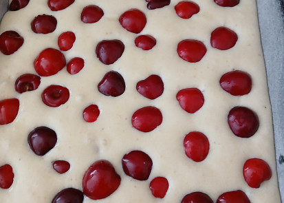 Třešně vypeckujeme a rybíz odstopkujeme. Ovoce propláchneme a osušíme papírovou utěrkou.Plech vymažeme tukem a vysypeme polohrubou moukou. Troubu včas předehřejeme na 180 °C.Žloutky oddělíme od bílků. K žloutkům přidáme krupicový cukr, vanilkový cukr a ušleháme hladký krém.Ve druhé misce vyšleháme z bílků a špetky soli tuhý sníh.Mouku promícháme s kypřicím práškem a prosejeme. Do žloutkové směsi přidáme citronovou kůru a střídavě přidáváme mouku a smetanu.Ušleháme hladký krém, do kterého opatrně vmícháme tuhý sníh.Těsto nalijeme do připravené formy a poklademe ovocem.Vložíme do trouby na dolní příčku a pečeme při 180 °C zhruba 30 minut. Upečenost kontrolujeme špejlí, kterou zapíchneme do bublaniny a po vytažení musí být suchá, bez drobečků.Bublaninu po upečení necháme vychladnout. Před podáváním ji hojně pocukrujeme.