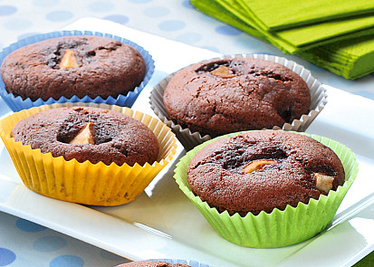 Máslo utřeme s moučkovým cukrem a vejci.Čokoládu nalámeme na menší kousky a rozehřejeme v mikrovlnné troubě. Přidáme ji k utřenému cukru spolu s mlékem a vanilkovým cukrem. Zamícháme a dále přidáme mouku s kypřicím práškem a kakaem.Hrušky oloupeme a zbavíme jádřinců. Nakrájíme je na malé kostičky. Ty smícháme s rozinkami, sáčkem vanilkového cukru a trochou rumu. Troubu zapneme na 180 °C.Do formy na muffiny nebo do papírových košíčků na muffiny dáme vždy lžičku hruškové směsi, lžíci těsta a na povrch dáme opět zbylé hrušky. Těsto musí sahat maximálně do dvou třetin formičky, aby v průběhu pečení nevyběhlo. Dáme do trouby předehřáté na 180 °C a pečeme asi 20 minut. Před vyjmutím z trouby provedeme zkoušku špejlí.
