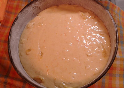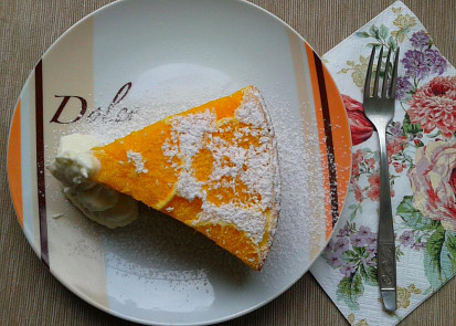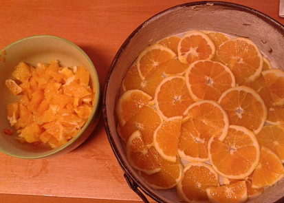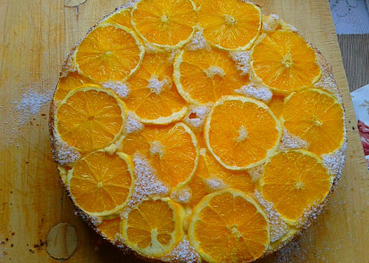 Boky formy vymažeme tukem a vysypeme hrubou moukou. Z pečicího papíru vystřihneme kolečko, které dáme na dno formy. Troubu včas předehřejeme na 180 °CNastrouháme kůru z 1 pomeranče, vydlabeme vnitřek a překrájíme na malé kousky.Z druhého pomeranče odkrojíme slupku a nakrájíme na tenké kolečka, kterými pokryjeme dno formy s papírem.Vejce , žloutek a cukr vyšleháme do husté pěny, zhruba 6-10 minut. Pak přišleháme smetanu, vmícháme mouku promíchanou s kypřicím práškem a nakonec nakrájený pomeranč i s kůrou.Těsto vlijeme do formy na pomeranče a dáme péci na 180 °C asi 35 minut.Po upečení obrátíme, sundáme formu a opatrně sejmeme papír. Koláč necháme zcela vychladnout.Koláč podáváme pocukrovaný s vyšlehanou smetanou nebo zmrzlinou.
