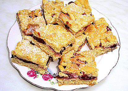 Plech vyložíme pečicím papírem. Troubu včas předehřejeme na 200 °C.Žloutky oddělíme od bílků. Polohrubou mouku promícháme s práškem do pečiva a prosejeme. Přidáme žloutky, cukr, Heru a vypracujeme těsto.Třetinu těsta vložíme do mikrotenového sáčku a dáme do mrazáku. Zbylé těsto vyválíme a dáme na připravený plech. Těsto můžeme vyválet malým válečkem nebo dát těsto na chvíli do lednice, aby se nám s ním lépe pracovalo. Švestky omyjeme a vypeckujeme. Z bílků vyšleháme tuhý sníh.Těsto poklademe vypeckovanými švestkami a posypeme mletou skořicí. Na švestky natřeme bílkový sníh.Na sníh nastrouháme na hrubém struhadle těsto z mrazáku.Plech vložíme do trouby. Řezy pečeme při 200 °C zhruba 20 minut.