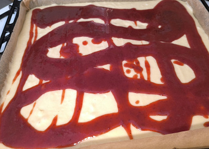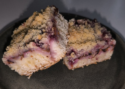 Nejprve připravíme omáčku. Švestky, cukr a vodu společně uvaříme. Poté rozmixujeme tyčovým mixérem a necháme vychladnout. Také je možné si omáčku uvařit den předem.Včas zapneme nahřívat troubu na 180 °C. Hlubší plech vyložíme papírem na pečení.Všechny suroviny na těsto dáme do misky a promícháme, aby se spojily v těsto.Těsto nalijeme na plech a přelijeme připravenou uvařenou omáčkou ze švestek.Na omáčku rozložíme vypeckované, na menší kousky pokrájené švestky.Povrch švestek zasypeme drobenkou, kterou jsme připravili promícháním všech připravených surovin.Vložíme do vyhřáté trouby a pečeme při 180 °C asi 35 minut.