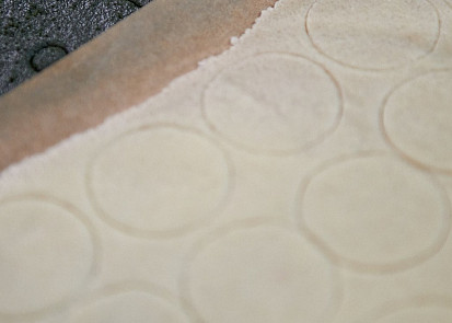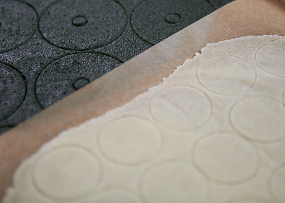 Křupavá vrstva těstu dodá skvělou texturu a křupavost. Obvykle se používá při výrobě Paris-Brest a éclairs. Připravíme bezbarvou a barevnou variantu.Na bezbarvou variantu vsypeme do misky 90 g hladké mouky, 90 g cukru krystal a 75 g čerstvého másla. Ručně zpracujeme do kompaktní hmoty.Na barevný croustillant dáme do mísy robotu 90 g hladké mouky, 75 g čerstvého másla, 90 g cukru krystal, 5 g kakaa a 0,6 g zeleného barviva. Robota zapneme na nízké otáčky. Postupně propracováváme, až vznikne kompaktní hmota, a poté ještě dopracujeme rukou.K rozvalování barevného těsta použijeme fólii o rozměru 40 × 60 cm, kterou můžeme nahradit stejně velkým archem pečicího papíru. Na jednu polovinu fólie položíme zelené těsto, druhou polovinu fólie přehneme přes těsto a válečkem opatrně rozválíme na tloušťku 1–2 mm. Těsto se nejlépe vyvaluje, když má pokojovou teplotu. Pokud bychom ho rozvalovali vychlazené, drolilo by se. Zelené těsto se hodí na Paris-Brest, proto si ho ihned předkrájíme a pak teprve dáme mrazit. Kdybychom ho krájeli až zmražené, praskalo by.Z těsta vykrájíme kulatým vykrajovátkem o průměru 6 cm a požadované tvary. Středy vykrojíme cukrářskou špičkou s rovným okrajem. Vykrájené tvary necháme ležet na jejich původním místě na fólii.Stejný postup vyvalování zopakujeme se světlým těstem, ale místo fólie použijeme pečicí papír. Při rozvalování průběžně vyrovnáváme záhyby, které se na pečicím papíře tvoří, a to z obou stran, jinak by se tvary v místě záhybů lámaly. Plát těsta rovnoměrně vyvalujeme až do tloušťky 1–2 mm.Ze světlého těsta vykrájíme kroužky o průměru 3,5 cm a obdélníčky o rozměru 12 × 2,5 cm. Po vykrájení pláty těsta opět přiklopíme pečicím papírem a takto připravené croustillanty vložíme na 10–15 minut do mrazáku.