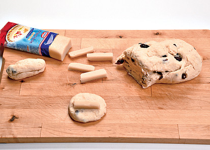 Plech vyložíme pečicím papírem. Troubu včas předehřejeme na 190 °C.Mouku promícháme s kypřicím práškem a vanilkovým cukrem.Změklé máslo utřeme s cukrem, přidáme tvaroh a promícháme. Spojíme se sypkou směsí, přidáme citronovou kůru, mandle a sušené ovoce. Pečlivě prohněteme.Z těsta oddělujeme kousky, ze kterých utvoříme malé bochánky, které pak rozmáčkneme na placku.Marcipán nakrájíme na hranolky.Do středu placky položíme hranolek marcipánu, přehneme a pevně přimáčkneme.Miništóly pokládáme na připravený plech. Plech vložíme do trouby a štoly pečeme při 190 °C zhruba 15–20 minut až do mírného zezlátnutí. Upečené štóly chvíli zchladnout.Štóly rozpuštěným máslem a hojně posypeme cukrem. Štóly necháme pár dní rozležet v chladu.