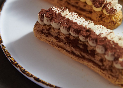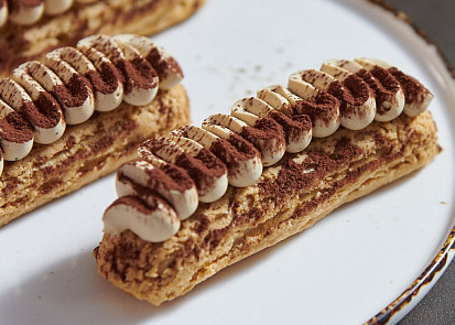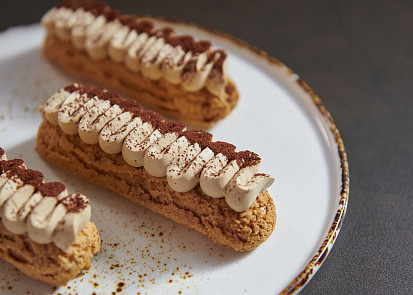 Odpalované těsto připravíme podle videonávodu a receptu Heleny Fléglové.Křupavou vrstvu připravíme podle receptu Heleny Fléglové.Troubu předehřejeme na 220 °C, na horkovzduch.Vychlazené odpalované těsto nastříkáme do požadovaných tvarů dle níže uvedeného videonávodu.Základy na éclairs jsou pokryté křupavou vrstvou, takže je můžeme péci na horkovzduch. Do vyhřáté trouby vložíme plech s éclairs a teplotu pečení ihned snížíme na 165 °C. Pečeme 30 minut, opět v průběhu pečení rozhodně troubu neotevíráme.Zdobení začneme tím, že si připravíme cukrářský vanilkový krém. Do kastrůlku nalijeme mléko, přidáme polovinu vanilkového lusku, kterou rozřízneme, vyškrábneme zrníčka, a i s luskem vložíme do mléka. Mléko pomalu zahřejeme, mezitím dáme do misky žloutky, cukr krystal a kukuřičný škrob a promícháme. Díky škrobu žloutky, a pak i celý krém, získá pudinkovou konzistenci. Do kastrůlku s mlékem přidáme sůl, která je velmi důležitá pro zvýraznění chuti.Do vyšší úzké nádoby dáme bílou čokoládu s 32 % kakaového másla. Jakmile se z mléka v kastrůlku začíná kouřit, část horkého mléka přimícháme do misky se žloutkovou směsí, abychom trochu vyrovnali teplotní rozdíl. Horké mléko přiléváme velmi pomalu, abychom žloutky neuvařili. Takto smíchané žloutky s částí horkého mléka vlijeme zpět do kastrůlku ke zbytku mléka. Nyní je směs nutné stále promíchávat metličkou až do zhoustnutí.Po zhoustnutí necháme krém ještě pár sekund provařit. Z hotového krému vyjmeme vanilkový lusk, a horký krém ihned nalijeme do vyšší nádoby na připravenou čokoládu, která se horkem rozpustí. Krém důkladně promixujeme ponorným mixérem do hladké homogenní hmoty, přidáme studené čerstvé máslo nakrájené na kostky a znovu promixujeme.Hotový krém je úplně tekutý, proto je potřeba ho vychladit. Přelijeme ho do velké mísy a přikryjeme ho na kontakt potravinářskou fólií, která zabrání vzniku škraloupu. Přikrytý krém necháme několik hodin odležet v lednici.Mezitím co se krém chladí, se pustíme do přípravy kávové šlehané ganache, která je založená na smetaně a čokoládě. Plátkovou želatinu vložíme na 3-5 minut do studené vody. Voda musí být opravdu velmi studená, protože želatina se rozpouští už při teplotě 28-32 °C.Smetanu, kterou budeme do ganache používat, rozdělíme na 2 části - první budeme zahřívat v kastrůlku, a druhou přidáme až v závěru, a ganache jí zchladíme.První část smetany vlijeme do kastrůlku, přidáme med, instantní kávu a hrubě nadrcenou zrnkovou kávu. Směs v kastrůlku za stálého míchání zahřejeme.Mezitím do vyšší nádoby nasypeme kousky čokolády Gold (můžeme ji nahradit klasickou bílou čokoládou). Plotnu s horkou smetanovou směsí vypneme a kastrůlek cca na 10 minut zakryjeme potravinářskou fólií. Díky tomu se krásně propojí všechny vůně a kávové aroma bude silnější.Kastrůlek s kávovou smetanou odkryjeme, plátkovou želatinu zbavíme vymačkáním přebytečné vody, a přidáme ji do smetanové směsi. Směs se želatinou už nezahříváme nad 80 °C, zničili bychom tak její funkčnost. Smetanu do vyšší nádoby s čokoládou přelijeme přes síto, které zachytí hrubá zrnka kávy.Směs ve vyšší nádobě nejdříve promíchneme stěrkou a přesvědčíme se, že se rozpuštěná čokoláda nepřilepila na dno či stěny nádoby. Pak celou směs promixujeme ponorným mixérem. Poté do směsi přilijeme druhou část smetany, díky které se krém zchladí, a znovu promixujeme. Ganache musíme důkladně vychladit, proto ji přelijeme do větší mísy, přikryjeme na kontakt potravinářskou fólií a dáme na 3-4 hodiny chladit do lednice. Nedostatečně vychlazený krém by se při šlehání srazil.Pustíme se do kompletace éclairs. Z mísy s vychlazenou kávovou ganache stáhneme potravinářskou fólii a krém přendáme do mísy robotu se šlehací metlou. Začneme šlehat na střední výkon, a až v průběhu šlehání výkon zvyšujeme, až má ganache pevnou konzistenci.Cukrářský vanilkový krém i šlehanou kávovou ganache naplníme do cukrářských sáčků bez špiček. Sáčky nikdy neplníme úplně doplna, krém se zahřívá teplotou ruky, a řídne, takže se s ním hůře pracuje.Do spodní části každé éclair uděláme špejlí 3 otvory, kterými je budeme plnit. Cukrářskému sáčku s vanilkovým krémem ustříhneme malou špičku a začneme éclairy plnit. Špičku strčíme do každého otvoru a krém stříkáme nejprve na jednu, a pak na druhou stranu, až je éclair úplně plný. Poznáme to i potěžkáním v ruce, musí být dostatečně těžký.Špičku cukrářského sáčku s kávovou ganache zastřihneme do obloučku a začneme jím éclairs zdobit. Na povrchu každého éclairu tvoříme z krému ozdobnou vlnovku, a nakonec ještě dozdobíme kakaem.Kakao na éclairs sypeme přes sítko, polovinu éclair podélně zakryjeme pravítkem a druhou polovinu posypeme kakaem. Vznikne tak krásný kontrast barev.