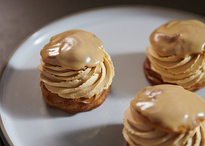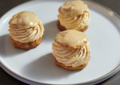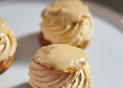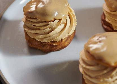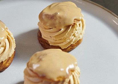 Odpalované těsto připravíme podle videonávodu a receptu Heleny Fléglové.Křupavou vrstvu připravíme podle receptu Heleny Fléglové.Troubu předehřejeme na 220 °C.Vychlazené odpalované těsto nastříkáme do požadovaných tvarů dle níže uvedeného videonávodu.Do předehřáté trouby vložíme plech s větrníky a teplotu ihned snížíme na 170 °C. Větrníky pečeme 25 minut. Větrníky mohou být po upečení trochu tmavší, je to proto, že jsme je před pečením sypali moučkovým cukrem, který mírně zkaramelizoval a vytvořil mírně tmavší odstín.Nejdříve připravíme vanilkový krém s mascarpone. Plátky želatiny vložíme na 3-5 minut do misky se studenou vodou.Vanilkový lusk rozřízneme, vyškrábneme zrníčka a i s luskem vložíme do kastrůlku. Do kastrůlku přilijeme 180 g smetany ke šlehání, 100 g mléka a začneme směs zahřívat.Mezitím v misce smícháme 80 g žloutků, 40 g krystalového cukru a 14 g kukuřičného škrobu.Smetanovou směs zahřejeme přibližně na 50 °C, část nalijeme do misky ke žloutkům, důkladně promícháme kvůli vyrovnání teplot a vlijeme zpátky do kastrůlku. Zahříváme za stálého míchání metličkou, protože směs začne houstnout. Jakmile krém začne houstnout, zmírníme teplotu a necháme ho pár sekund provařit. Nesmí se vařit déle, kukuřičný škrob by tak ztratil funkčnost.Želatinu vymáčknutím zbavíme přebytečné vody, přidáme ji do krému a promícháme. Z hotového krému vylovíme vanilkový lusk. Ještě horký krém přelijeme do vyšší nádoby, přidáme 160 g mascarpone a promixujeme ponorným mixérem.Do krému přidáme 60 g čerstvého másla nakrájeného na kostky a znovu důkladně promixujeme. Hotový krém přelijeme do větší mísy, zakryjeme na kontakt potravinářskou fólií a dáme na několik hodin vychladnout do lednice.Pustíme se do přípravy slaného karamelu. Do rendlíku nalijeme 80 g smetany ke šlehání a začneme pomalu zahřívat.Do druhého rendlíku dáme 50 g glukózy, 70 g krystalového cukru a 4 g soli a začneme pozvolna karamelizovat. Karamel v průběhu zahřívání průběžně opatrně promícháváme a hlídáme, aby se nepálil. Stačí, když se spálí malý kousek cukru, a celý karamel je pak nahořklý. Jakmile má karamel požadovanou zlatou barvu, zmírníme plotnu a do karamelu vmícháme 15 g čerstvého másla nakrájeného na kostky. Následně pomalinku za stálého míchání přiléváme ohřátou smetanu a chvíli provaříme.Hotový karamel přelijeme do větší mísy, zakryjeme na kontakt potravinářskou fólií a vložíme minimálně na 2 hodiny do lednice.Nyní připravíme karamelovou šlehačku. Do hrnce nalijeme 200 g smetany a začneme pomalu zahřívat. Druhý hrnec rozpálíme, a když je horký, vsypeme 50 g krystalového cukru, 60 g třtinového cukru a 1 g soli. Necháme karamelizovat.Smetanu ve druhém hrnci zahříváme proto, že vždy, když lijeme do horkého karamelu tekutinu, potřebujeme, aby měla podobnou teplotu. Do zkaramelizovaného cukru pomalu a za stálého míchání přilijeme horkou smetanu, a dobře provaříme. Horký karamel přelijeme do mísy, umístěné na kuchyňské váze, a přilijeme studenou smetanu do celkové hmotnosti 500 g. Přikryjeme na kontakt potravinářskou fólií a dáme na několik hodin chladit do lednice.Posledním komponentem k přípravě je domácí fondán. Do kastrůlku nalijeme 120 g mléka a začneme zahřívat. Druhý hrnec rozpálíme, a když je dostatečně horký, vsypeme do něj 90 g krystalového cukru a necháme zkaramelizovat. Do karamelu přilijeme horké mléko, dobře promícháme a chvíli provaříme, aby se kousky karamelu rozpustily. Přes sítko pak postupně přisypáváme 150 g moučkového cukru, který fondán zahustí, a vše vymícháme do krémové konzistence. Pokud bychom to s cukrem přehnali a fondán byl příliš hustý, stačí do něj přidat trochu mléka a důkladně rozmíchat.Vychlazený vanilkový krém přendáme do mísy robotu se šlehací metlou a prošleháme ho pár sekund na plný výkon dohladka. Hotový vanilkový krém naplníme do cukrářského sáčku s hladkou špičkou velikosti 10 mm.Do mísy robotu přelijeme základ na karamelovou šlehačku a vyšleháme. Jako vždy, když šleháme smetanu, začínáme na střední výkon a postupně zesilujeme. Šlehačku naplníme do cukrářského sáčku se špičkou tvaru hvězdy.Do cukrářského sáčku bez zdobicí špičky naplníme vychlazený slaný karamel, který má krásně krémovou konzistenci.Pustíme se do kompletace větrníků. Větrníky prořízneme vroubkatým nožem cca ve 2/3 jejich výšky. Odříznuté vršky namočíme do připraveného fondánu a odložíme stranou. Těsto ve spodní části větrníků můžeme prsty malinko promáčknout, vznikne nám tím více prostoru pro náplň. Do spodní části větrníků dáme zdobicím sáčkem slaný karamel (množství cca 1 lžička) a překryjeme ho vrstvou vanilkového krému.Nakonec ozdobně nastříkáme vrstvu karamelové šlehačky a větrníky přiklopíme horní částí, namočenou ve fondánu.