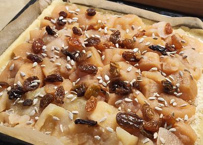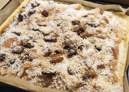 Mouku, změklé máslo, kypřicí prášek, cukr a vejce smícháme v misce a vypracujeme hladké těsto. Zabalíme do fólie a necháme zhruba 1 hodinu odpočinout v chladu.Mezitím připravíme jablka, která oloupeme a nastrouháme nebo nakrájíme na drobné kousky. Nebo použijeme zavařená a již nastrouhaná jablka.Včas rozehřejeme troubu na 180 °C a připravíme plech, který vyložíme papírem na pečení.Odpočaté těsto rozdělíme na dvě poloviny a každou rozválíme na placku.První placku dáme na připravený plech a lehce zasypeme strouhankou. Na ni rozprostřeme jablka, posypeme cukrem, skořicí, rozinkami a ořechy (v množství dle chuti) a znovu zaprášíme strouhankou. Zakryjeme druhou plackou a spoje utěsníme.Povrch propícháme několikrát vidličkou, potřeme žloutkem rozkvedlaným v mléce a dáme péct do vyhřáté trouby při 180 °C dozlatova asi 30-40 minut.Hotový závin necháme vychladnout a pocukrujeme moučkovým cukrem.