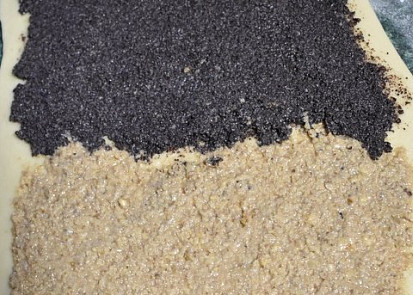 Maková náplň: Mák vsypeme do vařícího mléka a za stálého míchání chvíli povaříme. Do prochladlého pak vmícháme zbytek surovin.Náplň ořechová: Ořechy vsypeme do vařícího mléka a za stálého míchání necháme chvíli propařit. Do vychladnutých pak vmísíme zbytek surovin.Náplň tvarohová: Všechny suroviny spolu jen promícháme.Z menší části vlažné tekutiny, lžičky cukru, všeho čerstvého droždí a 1-2 lžic mouky (vše z připravených, odvážených surovin) umícháme kvásek, který necháme asi 20 minut kynout.Potom ke kvásku přidáme zbytek surovin, uhněteme a dobře propracujeme těsto, které necháme zakryté v míse cca hodinu kynout.Plech vyložíme pečicím papírem. Včas zapneme nahřívat troubu na 190 °C.Vykynuté těsto vytáhneme na stůl, rozdělíme na poloviny a z každé vytvarujeme štědrý závin: