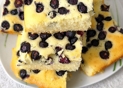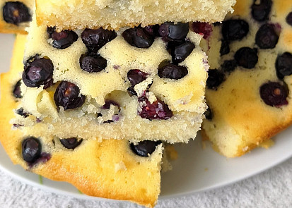 Troubu rozehřejeme na 180 °C. Plech vyložíme papírem na pečení.Všechny suroviny, kromě borůvek, dáme do mísy, případně do mísy robota a promícháme. Nalijeme na plech s pečicím papírem.Povrch těsta poklademe čerstvými borůvkami.Vložíme do vyhřáté trouby a pečeme asi 20-30 minut. Propečení kontrolujeme špejlí (vpíchneme ji do těsta, po vytažení musí být suchá, bez těsta).