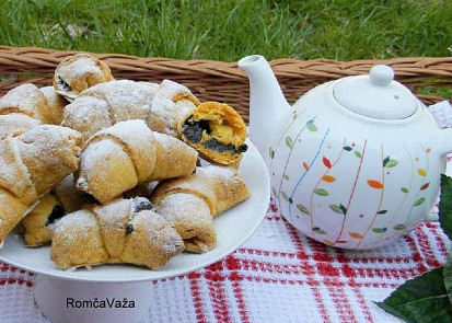 Mrkev očistíme a nastrouháme na jemném struhadle. Nastrouháme k ní citronovou kůru z dobře omytého citronu, přidáme ostatní suroviny na těsto a dobře propracujeme. Hotové těsto zabalíme do fólie a dáme na hodinu do lednice.Troubu předehřejeme na 200 °C a plech vyložíme papírem na pečení.Na pomoučený vál si dáme těsto a rozdělíme jej na 4 díly. Každý díl rozválíme dokulata a rozkrájíme na 12 dílků.Na každý dílek, na širší jeho část, dáme lžičku náplně a svineme ho do rohličku. Všechny rohlíčky uložíme na pripravený plech.Povrch rohlíčků potřeme rozšlehaným vajíčkem a vložíme je do předem vyhřáté trouby. Pečeme na 200 °C dozlatova, asi 15 minut.Upečené rohlíčky na talíři pocukrujeme.
