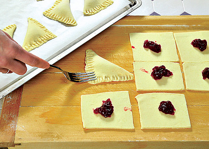 Z tvarohu, změklého másla a polohrubé mouky vypracujeme těsto, které necháme v lednici alespoň hodinu uležet a ztuhnout.Včas zapneme nahřívat troubu na 180 °C. Připravíme plech na pečení a vyložíme ho pečicím papírem.Na pomoučeném vále rozválíme těsto a rádýlkem nakrájíme čtverečky o velikosti 8 x 8 cm.Na každý čtvereček naneseme lžičkou zavařeninu a přehneme. Pomocí vidličky přitlačíme okraje k sobě, aby se šátečky během pečení nerozevřely. Šátečky pokládáme na připravený plech.Pečeme v předehřáté troubě při 180 °C asi 15-20 minut dorůžova. Ještě horké šátečky obalíme nebo posypeme moučkovým cukrem.
