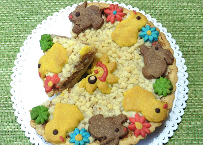 Formu o průměru 22-23 cm vyložíme pečicím papírem.Těsto: Všechny suroviny zpracujeme na vláčné těsto a necháme hodinu v chladu odpočinout.Do mísy vsypeme všechny suroviny na drobenku a dobře promícháme.Jablka oloupeme, odstraníme jádřinec, nastrouháme na slabé plátky, posypeme cukrem, skořicí, pudinkovým práškem a zamícháme.Od těsta oddělíme 2/3 těsta a rozválíme ho na plát velký tak, aby pokryl dno i stěny formy. Jablečnou směs rozprostřeme po celé ploše koláče a posypeme drobenkou.Troubu předehřejeme na 180 °C.Zbylé těsto rozdělíme na několik částí, každou obarvíme jinou barvou, vykrojíme různé velikonoční tvary a položíme je okolo okraje koláče.Pečeme na 180 °C po dobu 25-30 minut.