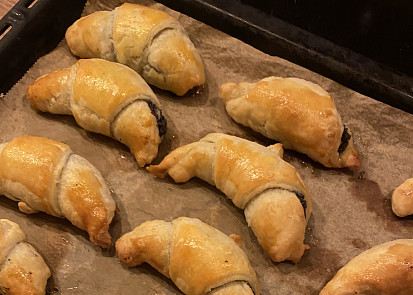 Z mouky, Hery, smetany, špetky soli a vejce vypracujeme kompaktní těsto a necháme jej chvíli v chladu odležet.Na náplň smícháme ořechy s dalšími surovinami. Troubu zapneme včas na 180 °C. Plech vysteleme pečicím papírem.Těsto rozdělíme na 5 částí a každé části vyválíme kolo, které nakrájíme na 8 stejných trojúhelníků.Na širší část dílku položíme náplň a zarolujeme směrem ke špičce.Rohlíčky rozložíme na plech, potřeme rozšlehaným vajíčkem. Vložíme do rozehřáté trouby a pečeme zhruba 15 minut do zrůžovění.
